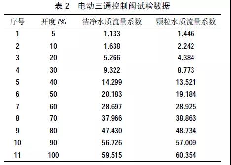 試驗(yàn)裝置研制后,對(duì)3 臺(tái)調(diào)節(jié)閥進(jìn)行了試驗(yàn)。從裝置的測(cè)試數(shù)據(jù)分析,其試驗(yàn)過(guò)程具有重復(fù)性。以第2 次試驗(yàn)閥門(mén)(電動(dòng)三通控制閥)為例,口徑為DN80,單座式結(jié)構(gòu),試驗(yàn)數(shù)據(jù)見(jiàn)表2。在顆粒水介質(zhì)與潔凈水介質(zhì)下,閥門(mén)測(cè)試數(shù)據(jù)的變化較小。閥門(mén)在關(guān)閉狀態(tài)下的泄漏量約為200 mL/min。